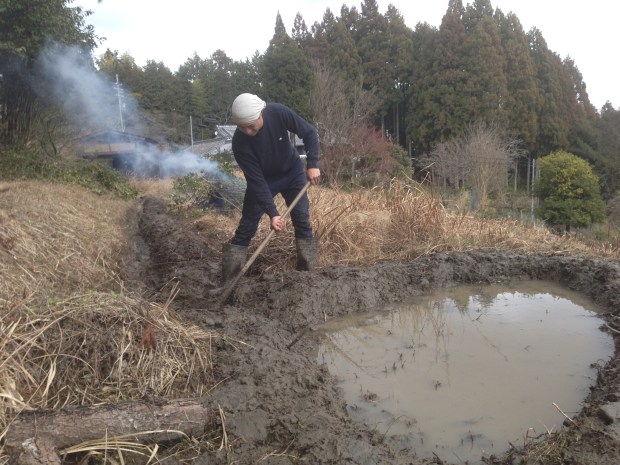 それならいっそ、池を掘ってそこに水を誘導するようにした方がいいのではないか、ということで、今年の2月末頃、鍬をふるって池を掘った。掘っただけでこれだけ水が貯まる。ただ、晴れが続くと干上がってしまうので、沢から少しだけ水が引けるようにしておいた。