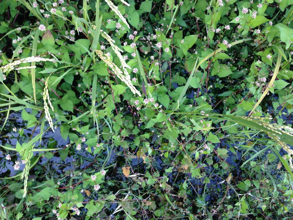 夏を越え、秋を迎えると、水辺の草に交じって稲まで生えてきた。少し赤みのある白い花はミゾソバ。水のあるところ、湿ったところで、這うようにして茎をのばし、地面も水面も覆いつくしてしまうので、厄介な「雑草」には違いないのだが、私は好きだ。ミゾソバはここだけでなく沢や田んぼの周辺に繁盛しているし、どれだけ熱心に引き抜いてもまた生えてくる。愛しい。腹立たしい。
